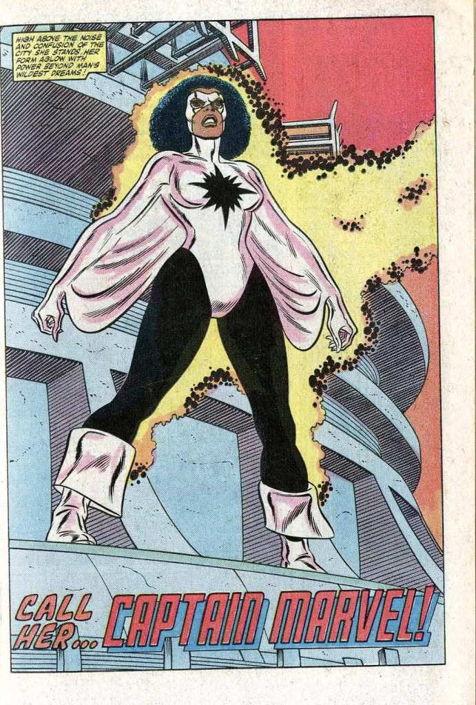 I remember well picking up that Spider-Man annual and young Nik being dazzled by the splash page debut of this new Captain Marvel, standing tall and proud on the Empire State Building. Even in 1982, she was a striking character – a strong, confident Black woman from New Orleans who managed to utterly avoid a lot of the cliches about Black heroes – she wasn’t “angry” like Luke Cage or mysteriously foreign like the Black Panther. She was relatable in a way many previous Black heroes weren’t. She wasn’t quite like anybody I’d seen in comics before, which were still a pretty lily-white area in 1982.