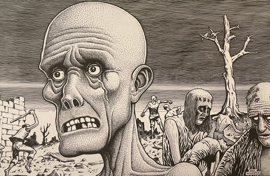 Wolverton did slapstick surreal humour and gritty, unsettling horror, as well as his oddball series of “heads” – staggeringly ugly, creepy little portraits that were like David Cronenberg nightmares. Some of them famously ended up on the covers of MAD and Plop.
