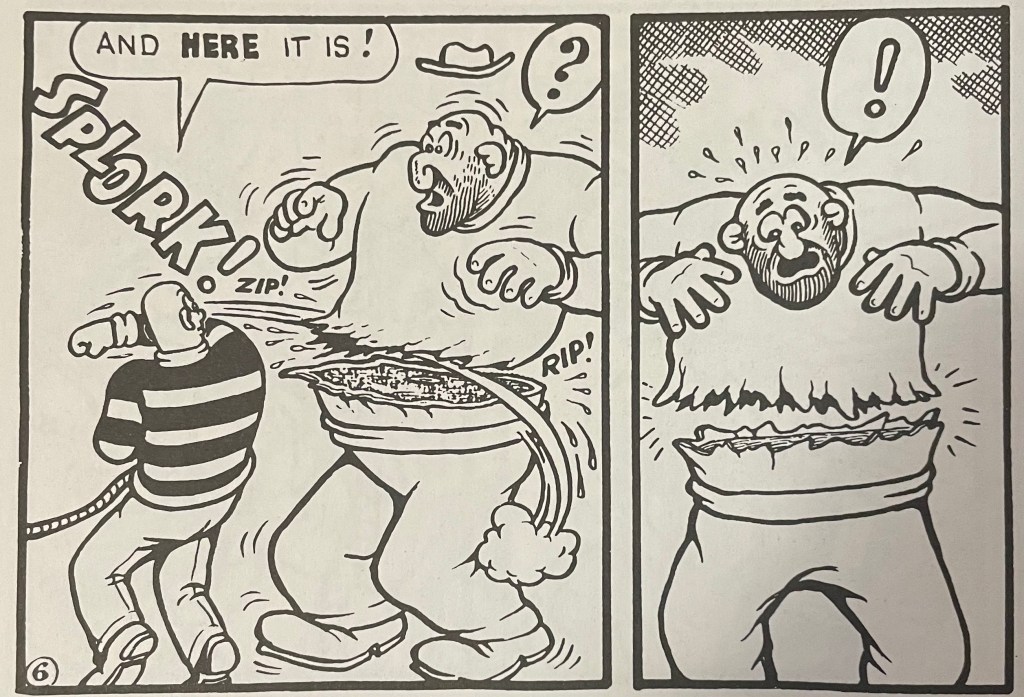 Wolverton also spent years doing screwball slapstick comics, packed with groan-worthy puns and wordplay and rubbery hijinks. I recently picked up a old reprint of some of his Powerhouse Pepper stuff, which is fantastic fun. Powerhouse is a kind of kinder, gentler version of Popeye who fumbles his way through a world of bullies and hucksters with an oblivious charm. There’s lots of silly wordplay and a general looseness (I’d love to see more of this rare work reprinted!) but there’s also some of Wolverton’s trademark shock such as this great sequence below (don’t worry, I’m sure that guy was OK). He brings the rubbery antic energy of Tex Avery cartoons to the still comics page.