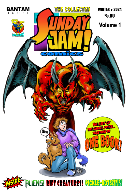 Back to comics, perpetual motion machine Jason DeGroot has been organising a massive jam comic featuring dozens of small press creators, The Sunday Jam! A lot of these projects fizzle out but this one has been barrelling along all year with a new page each week, and I was pleased to take part with a page back around Christmas. Coincidentally mine is the last page in the new Collected Sunday Jam Volume 1 gathering up the first 28 pages of this epic, oddball and sometimes totally insane adventure! You can order the collected Jam for a mere $5 right here, and enjoy a mad sampler of small press talent, or give the project so far a read if you’re jam-curious. Do it!