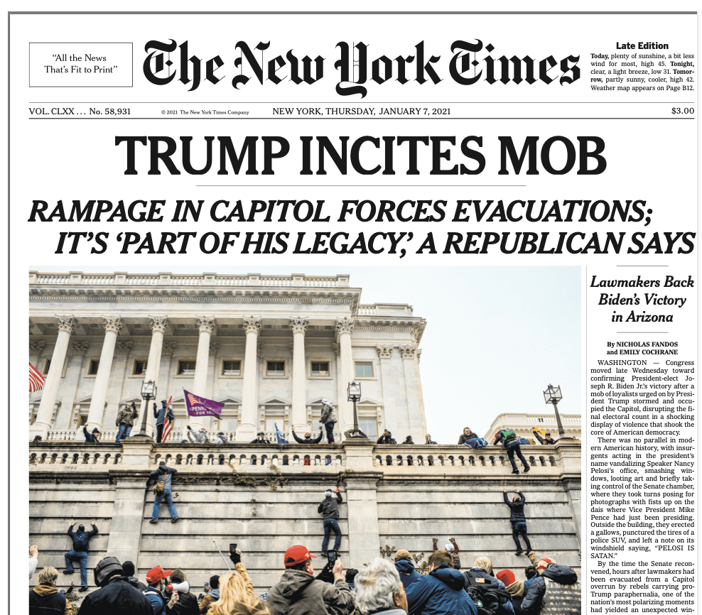For a brief moment America seemed united in its disgust over that day – the New York Times front page shouted “TRUMP INCITES MOB” in all caps, The Washington Post called it “pathetic and horrifying,” and even the conservative Wall Street Journal called for the President to resign. “It is best for everyone, himself included, if he goes away quietly,” the Journal said.