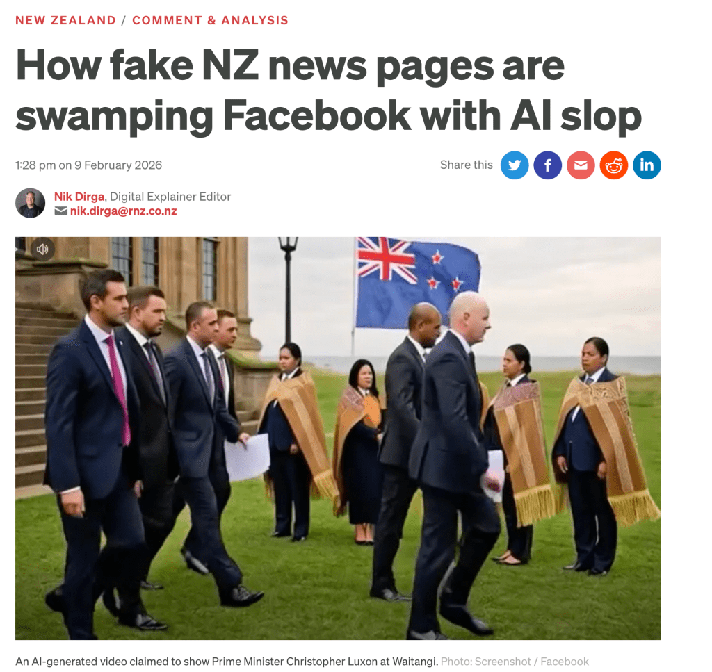 How fake NZ news pages are swamping Facebook with AI slop (RNZ)