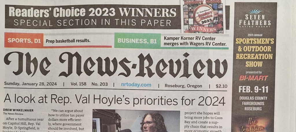I read today that the last newspaper I worked for in the US before moving to New Zealand almost 20 years ago is ending its print edition this month, “pivoting to digital” entirely as the kids say. The Roseburg, Oregon News-Review dated back almost 160 years. It’s a damned shame, and is surely likely to lead to more of these cursed “news deserts” that are spreading across America.