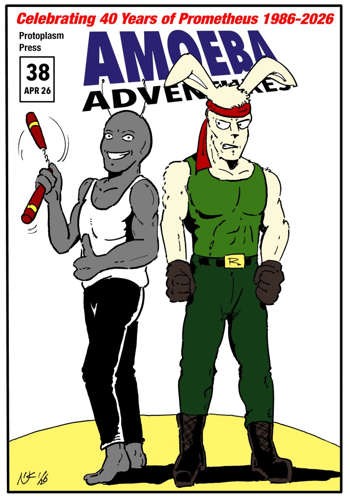 Amoeba Adventures #38, 2026 [PDF]: This issue, Ninja Ant has to get a job! But it all goes hilariously wrong when he teams up with our old pal Rambunny to face the unbelievable menace of… well, let’s not spoil everything, shall we? Plus: Prometheus the Protoplasm turns 40 in 2026, here’s a special look back at how it all began!